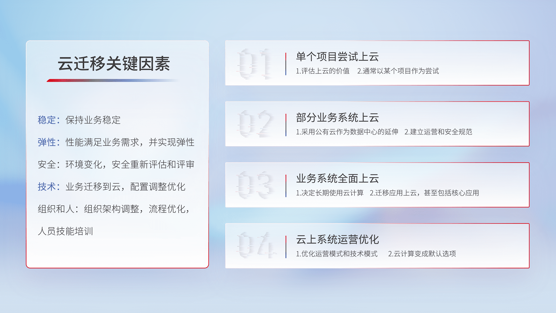 结合实际业务,,从规划设计、、、云平台选型、、、、云原生改造、、、数据迁移、、、集成交付,,,,迁移全过程为客户识别最佳上云路径,,,,做好风险识别管理,,,,设计网络架构、、、身份权限、、、、安全审计合规、、操作审计、、、、日志审计、、、、监控告警策略、、多站点容灾设计等,,,对云上基础设施进行整体规划,,提升IT治理水平,,,,以满足弹性、、高可用、、高性能的需求。。
